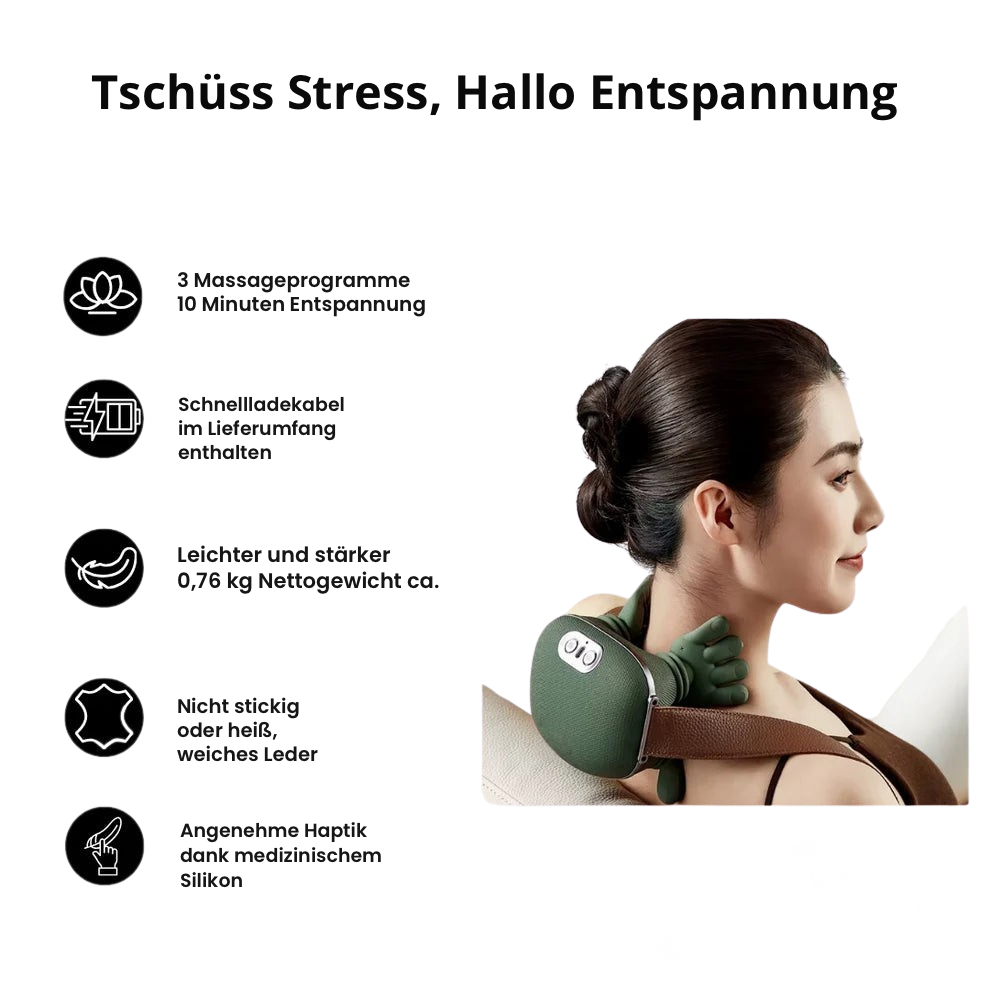 Ich arbeite viele Stunden am Schreibtisch und habe ständig Verspannungen im Nacken und in den Schultern. Ich habe Massagegeräte und diese billigen Massagegeräte von Amazon ausprobiert, aber nichts hat die Verspannungen wirklich gelöst. Dieses Gerät fühlt sich an, als würden echte Hände die Verspannungen lösen. Die Wärme ist himmlisch. Ich benutze es jeden Abend vor dem Schlafengehen und schlafe so gut wie seit Jahren nicht mehr.